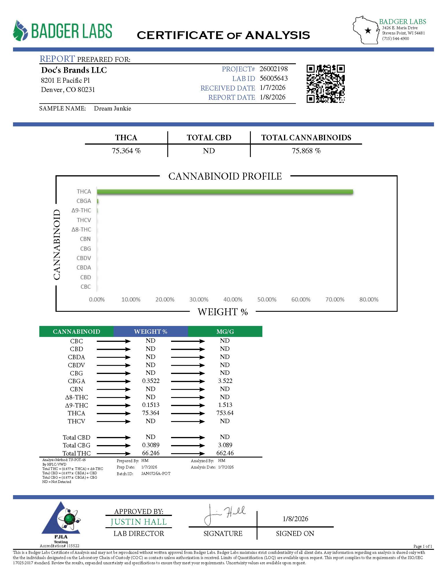 Fresh frozen Dream Junkie THCA rosin, made with solventless extraction. Full-spectrum terpenes and premium potency at an affordable price.